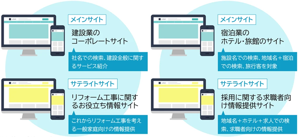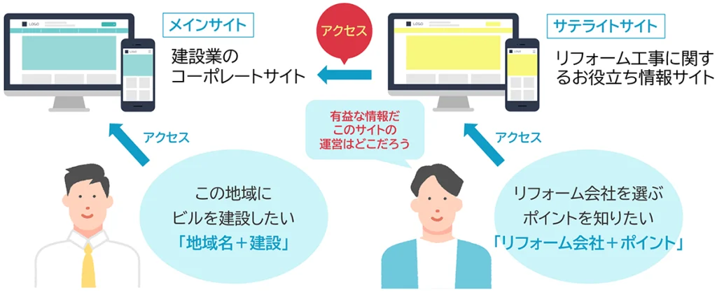 建設業を事例としていますが、メインサイトでは企業情報を発信し、サテライトサイトでは内装リフォームに特化した情報を掲載しています。