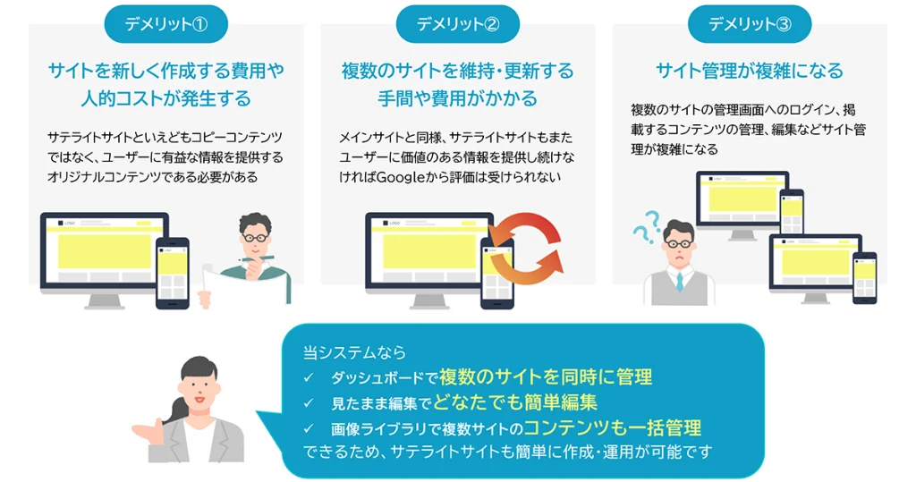 当システムであれば、見たまま編集による人に依存しない編集作業が可能であることによる人的リソースの効率化、ダッシュボードによる複数サイト管理やコンテンツの一括管理などを活用して、デメリットを解消することも可能です。