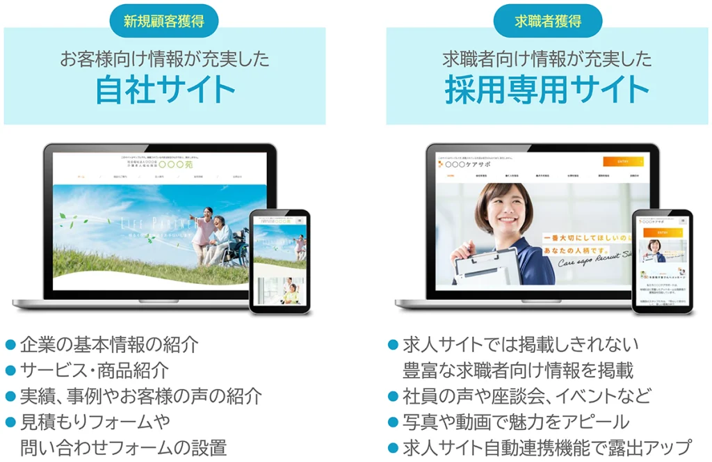 メインサイトは自社サイトとして新規顧客開拓を目的として、企業の基本情報などを掲載していますが、サテライトサイトは採用専用サイトとして求職者向け情報を掲載し、求職者獲得を目的として作成します。