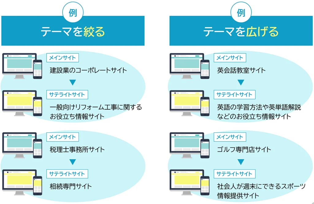 たとえばテーマを絞るには、メインサイトは建設業のコーポレートサイトであった場合、サテライトサイトはリフォーム工事に関するサイトにする、などです。