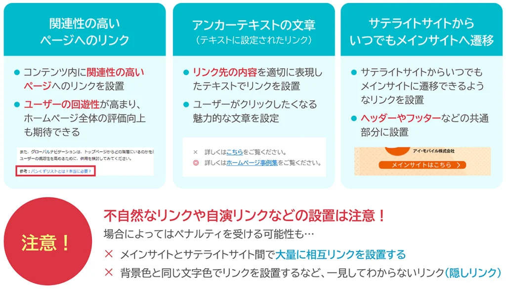 ただし、リンクについては、以下のような不自然なリンクや自演リンクなどの設置はペナルティを受ける可能性もありますので、注意が必要です。