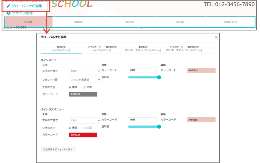 グローバルナビ編集画面で、お好みのデザイン設定を行ってください。