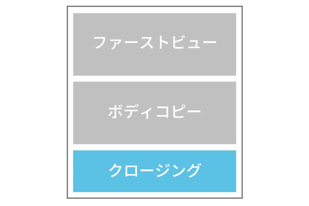先ほどのファーストビュー・ボディコピー・クロージングごとに配置するコンテンツやライティングがあるので、それぞれ把握しておきましょう。
